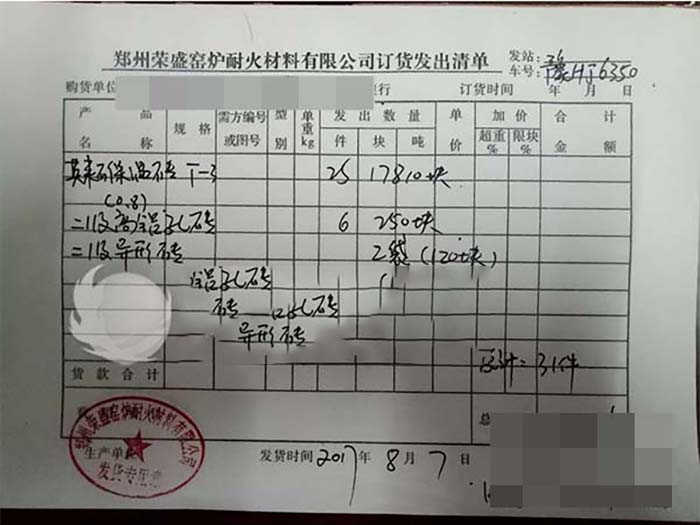 這次發(fā)貨的對(duì)象是江西的客戶,江西的客戶要了17810塊t-3莫來(lái)石保溫磚、250塊二級(jí)高鋁孔磚、120塊二級(jí)異型磚。江西客戶也是榮盛的老客戶了,這次的訂單江西客戶對(duì)榮盛表現(xiàn)出了十分的信任,并沒有派人再到鄭州進(jìn)行考察,是直接給榮盛銷售達(dá)到電話訂的單,并且在電話里表達(dá)出了想和榮盛保持長(zhǎng)期合作的態(tài)度,出于對(duì)合作伙伴的支持,榮盛也給了江西客戶優(yōu)惠的價(jià)格。